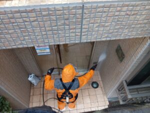 外壁は高圧洗浄にて汚れ・排気ガス・コケを除去していきます。