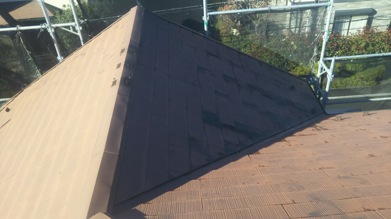 まずは各所役物を取り外し、今回の既存のスレート屋根に防水シートを貼ります。防水シートは耐久性の高い田島ルーフィングのPカラーEX+を使用しました。